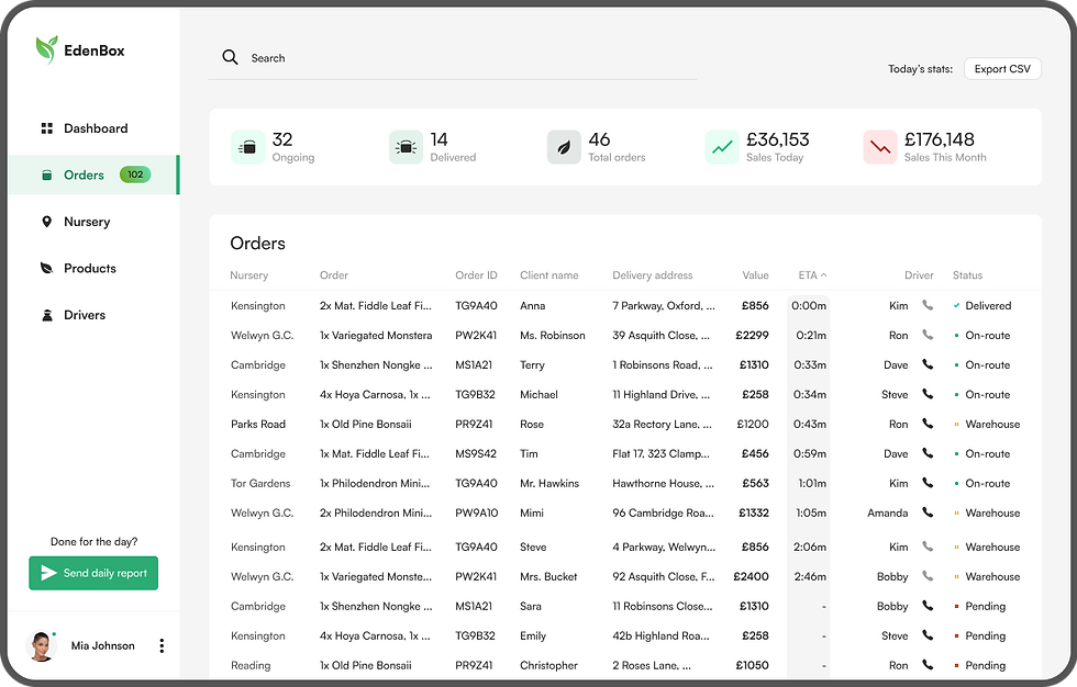 Thorough research illuminated the critical need for a unified solution to alleviate Grace's challenges at EdenBox. The current pain points, as experienced by our primary user persona, Grace, revolve around managing orders, coordinating with multiple stores, assigning delivery drivers, and overseeing vehicles— all scattered across disparate systems. These fragmented processes led to inefficiencies, hindering real-time tracking, impeding seamless communication, and complicating report generation. The envisioned SaaS platform emerges as a transformative solution tailored to address Grace's frustrations directly. By centralising these functions into a cohesive platform, the SaaS solution promises to enhance efficiency, streamline data integration, and facilitate robust reporting capabilities. This strategic approach not only mitigates the complexities faced by Grace but also amplifies EdenBox's operational effectiveness. In the subsequent sections, I will delve into the UI design process, highlighting the steps taken to craft a user-centric solution that encapsulates pivotal UX principles.